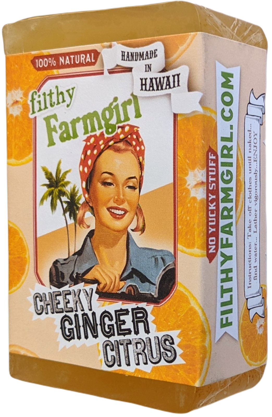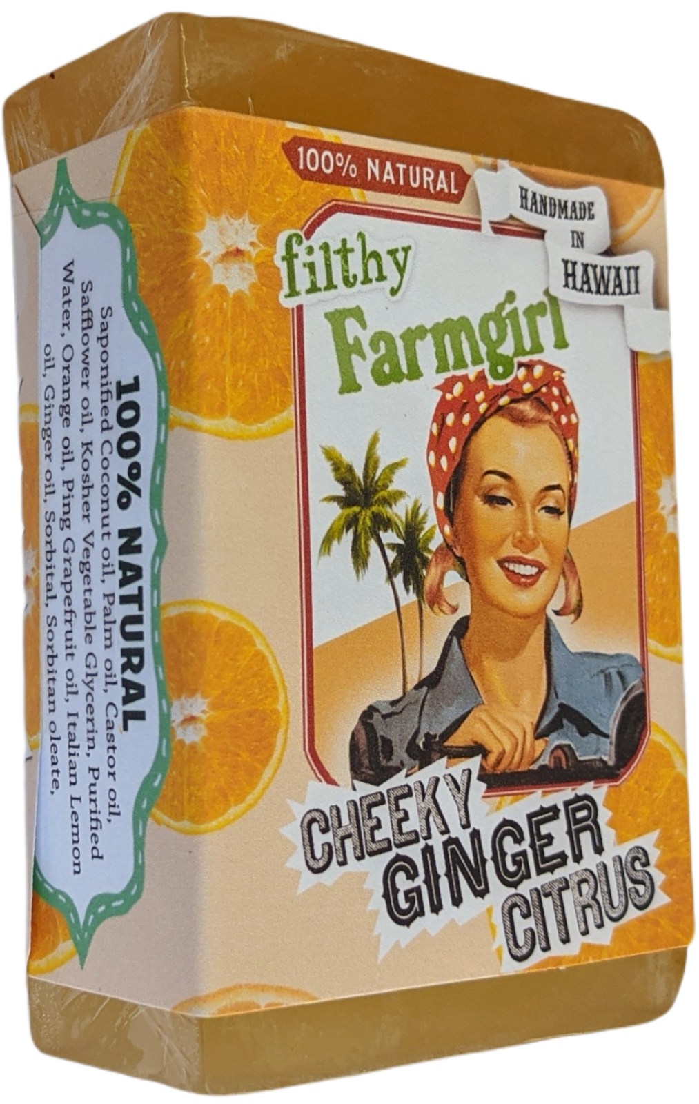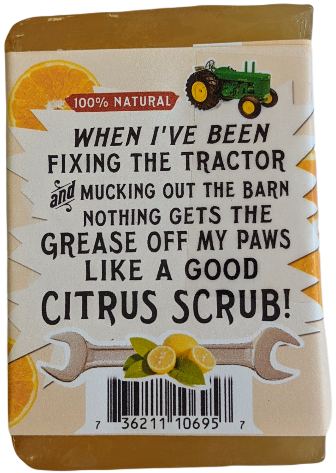 "When I've been fixing the tractor, and mucking out the barn, there's nothing like a good citrus scrub to get the grease off my paws." "The fresh-sqeezed flavors of sweet Orange, Pink Grapefruit, and Italian Lemon quenches my pores and the Ginger really gives my skin a healthy zing!"